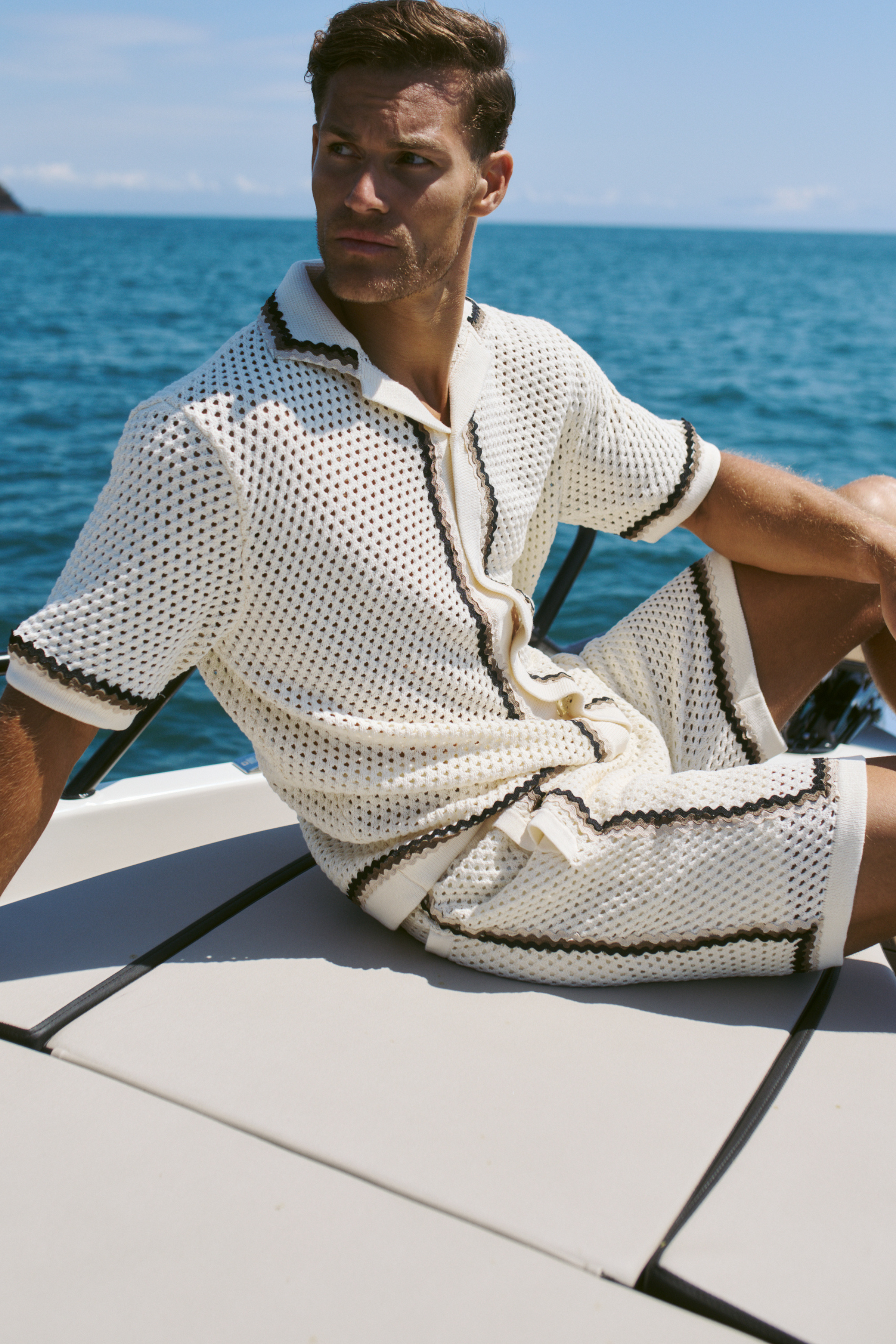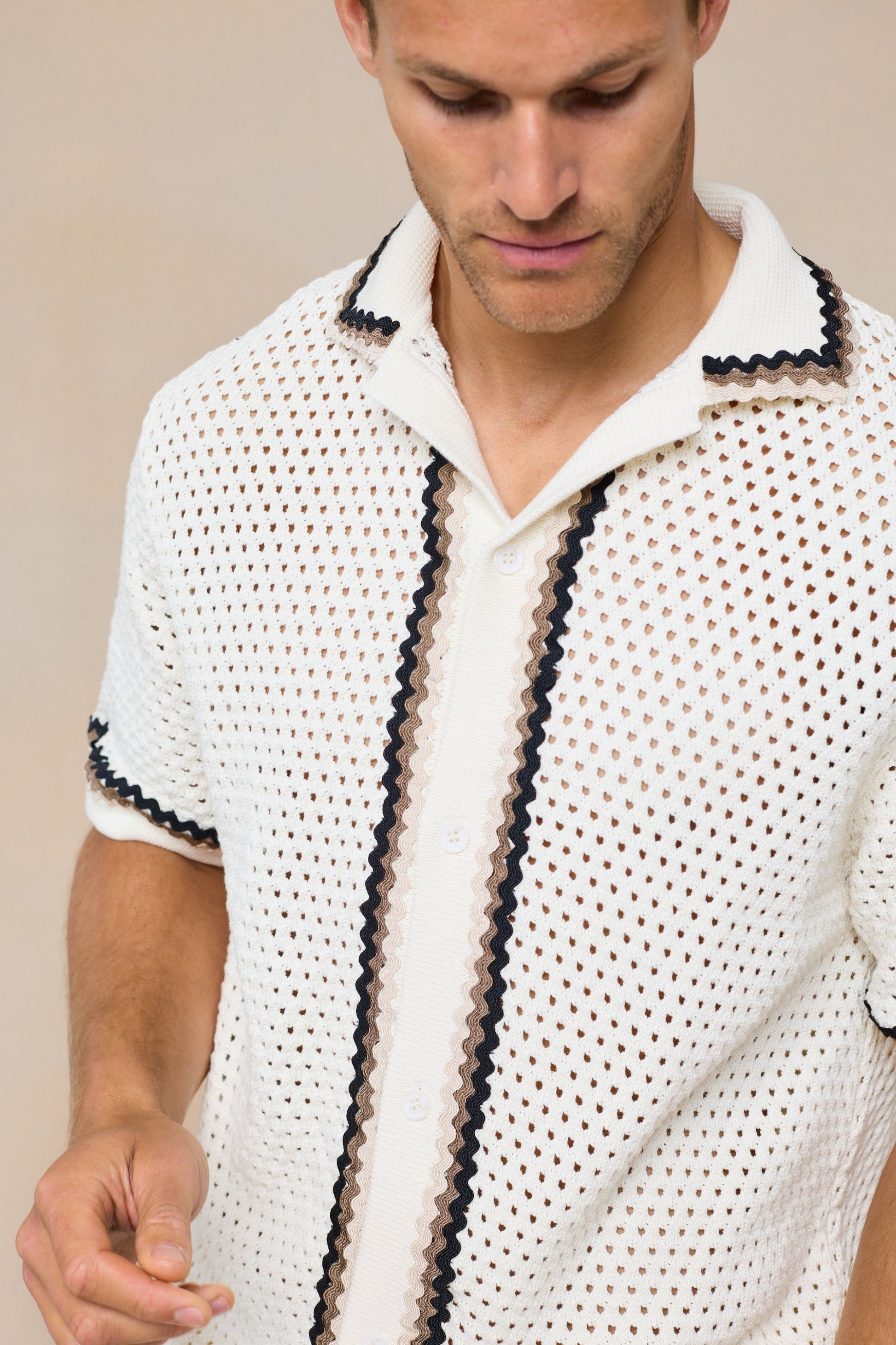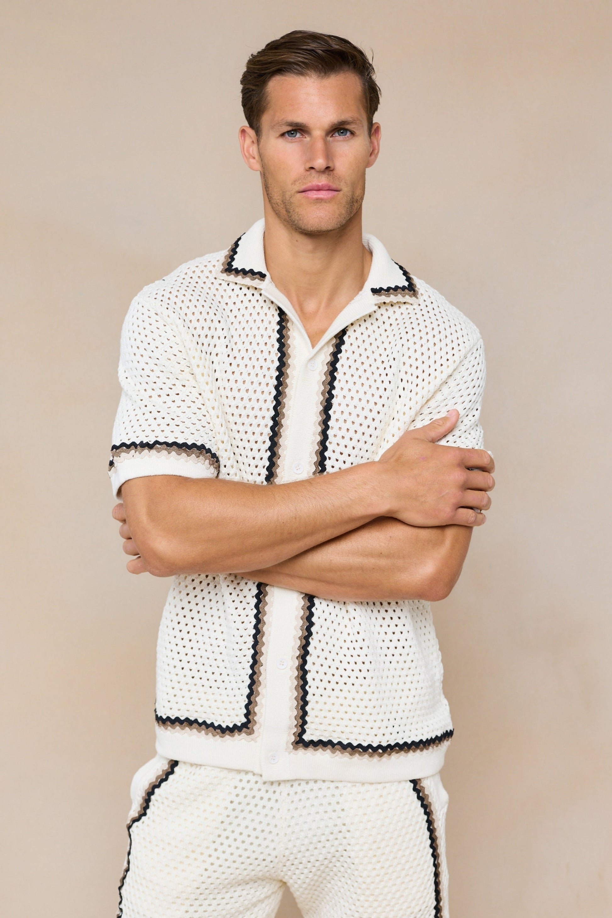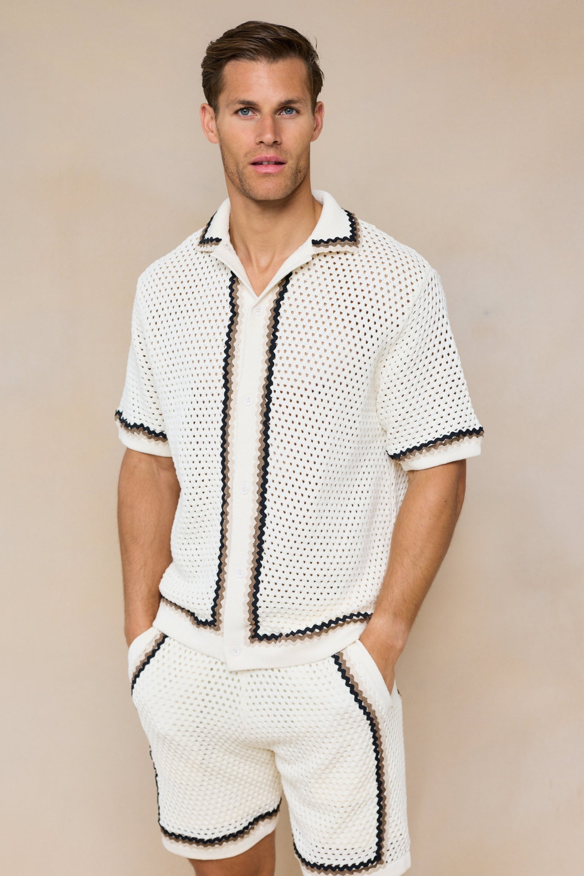 The Marconi Knit Shirt combines comfort and style with its soft 100% cotton open crochet knit design. It features two chest pockets for practicality, complemented by zigzag trim detailing and tonal branded buttons for a touch of sophistication. Pair it with the matching Marconi Knit Short for a coordinated summer look.