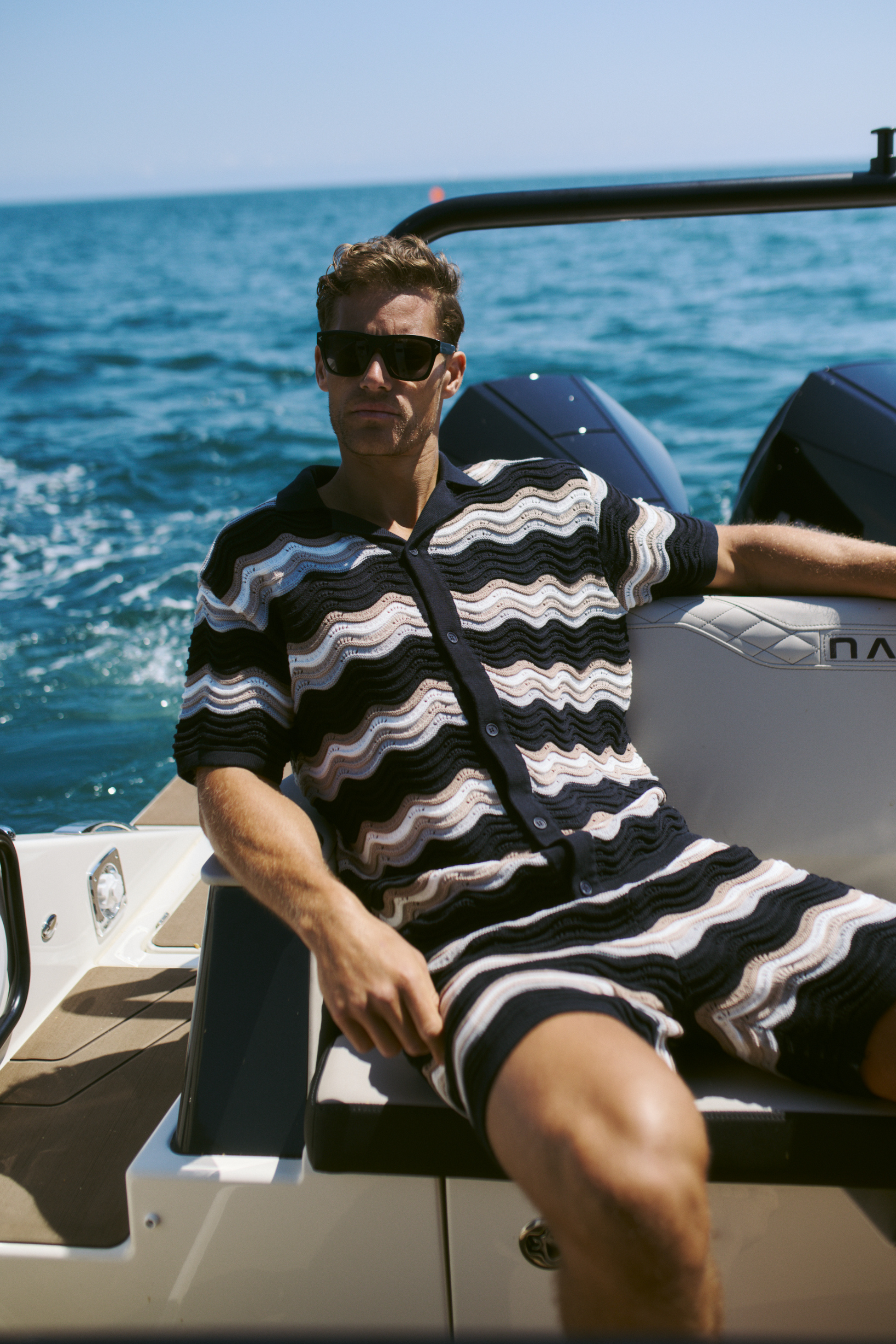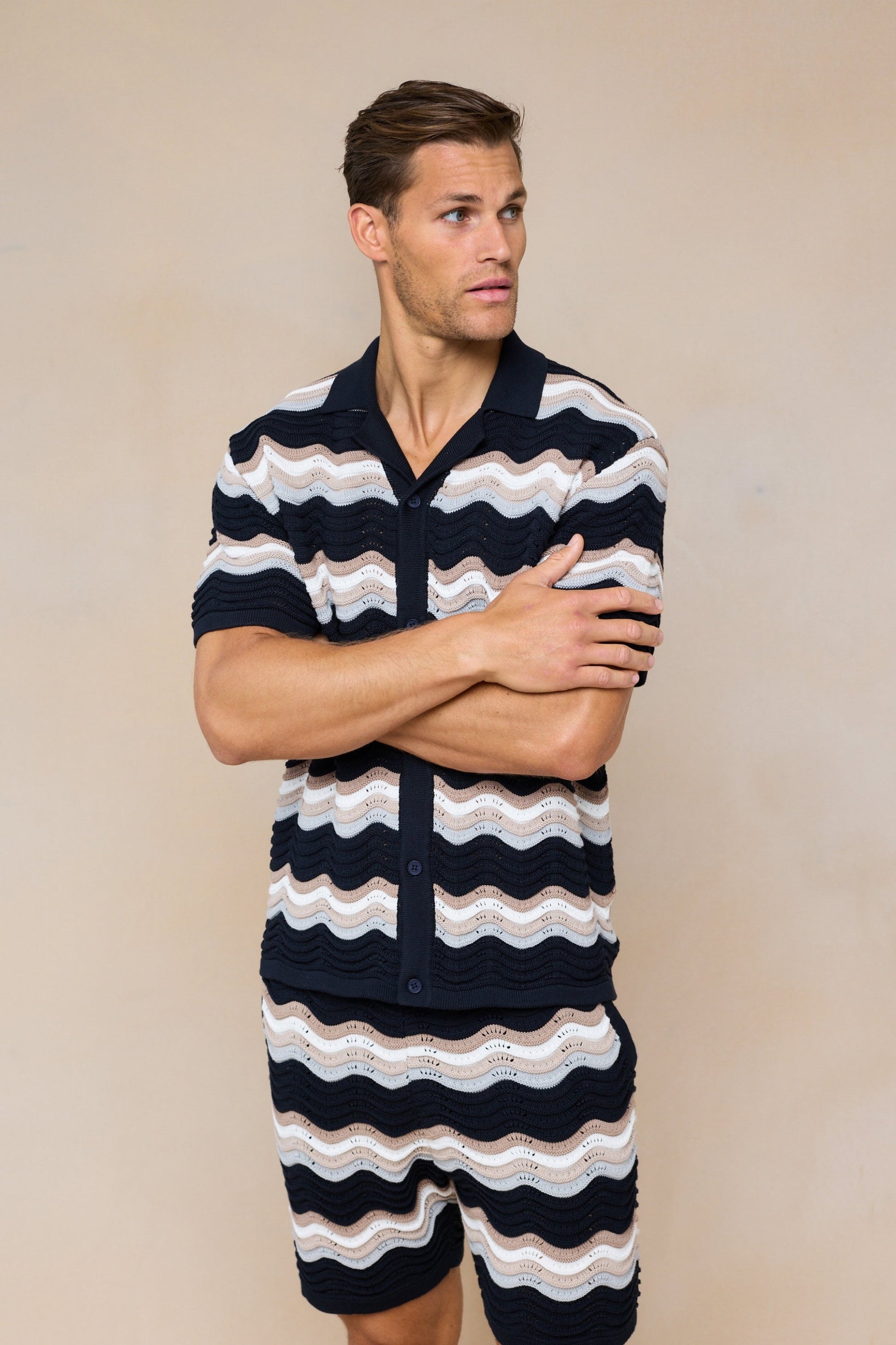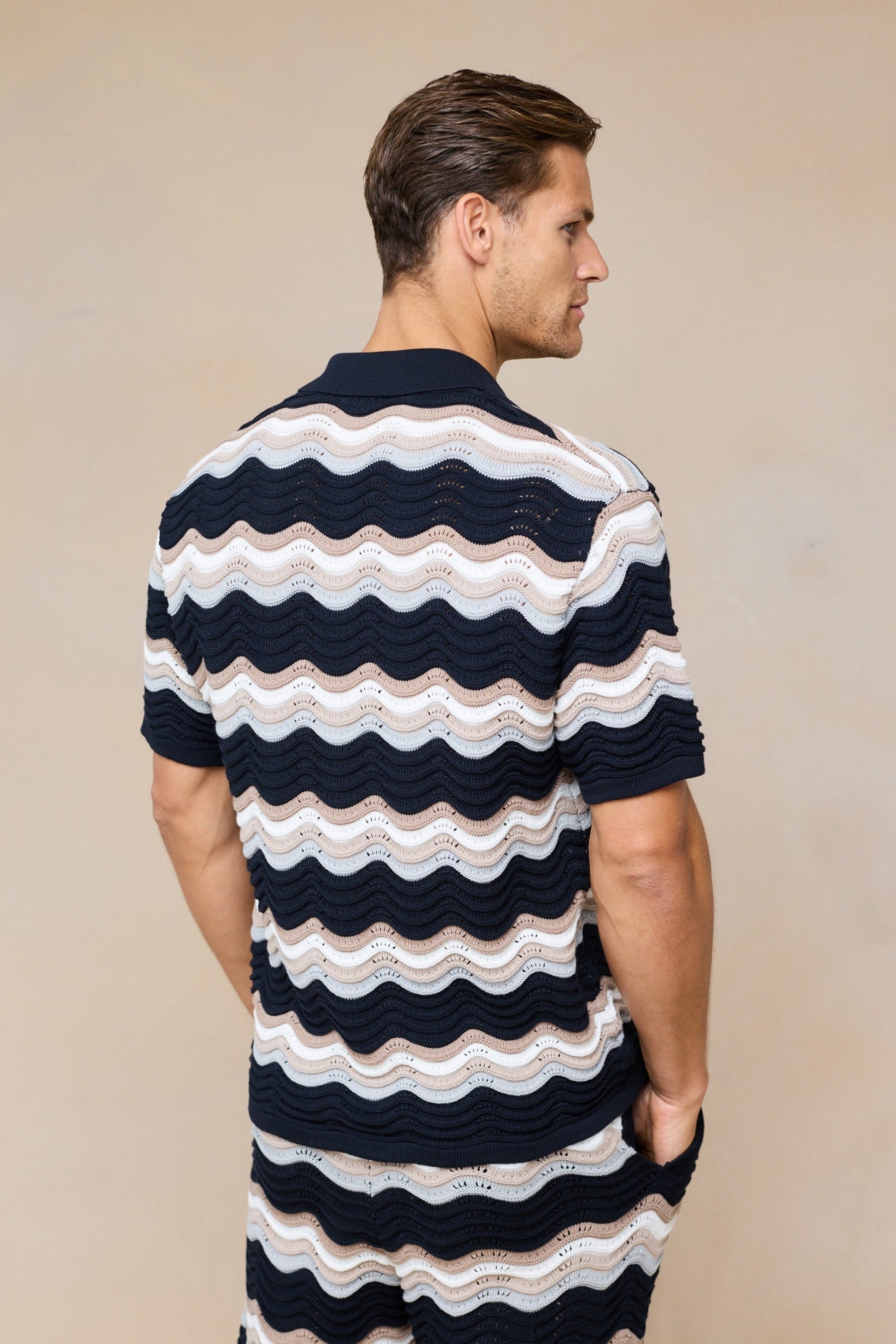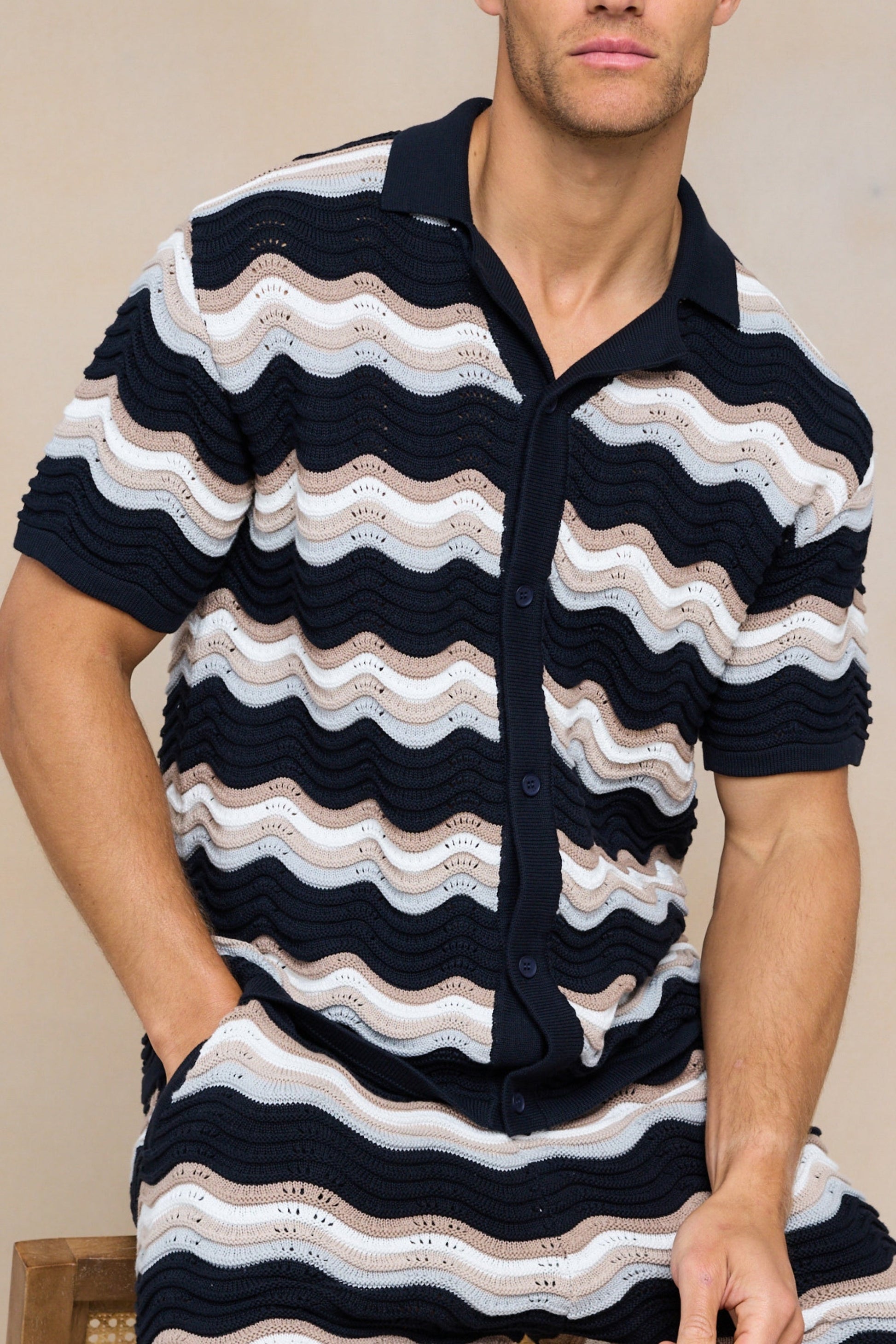 The Primavera Crochet Knit Shirt combines elegance and comfort with its soft 100% cotton open crochet knit and distinctive wavy design. Tonal branded buttons add a refined touch, enhancing its sophisticated appeal. Pair it with the matching Primavera Crochet Knit Short for a coordinated ensemble that effortlessly blends style and comfort.